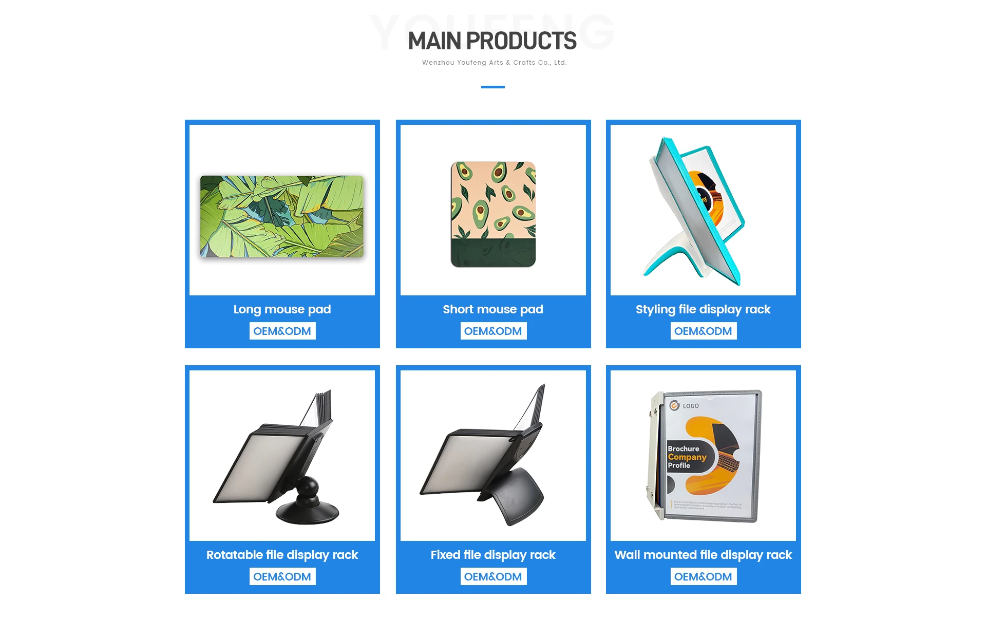 Productos principales:Alfombrilla de ratón, alfombrilla de comida, alfombrilla de mesa, estante de exhibición de archivos, estante de exhibición de volteo de página